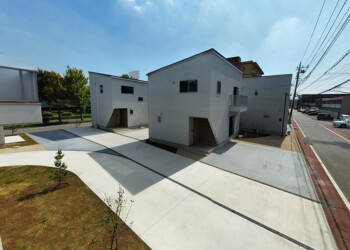 角度を振った切妻屋根の建物がランダムに配置される光景は、2階建ての多いつくば市の景観になじみます。敷地内の車道と駐車場を庭の一部の連続体としてグラフィカルに見せることで、駐車場=空き地という印象を払拭させ、敷地全体を大きな庭のように見立てます。住戸のプライバシーと日射に配慮した位置に植栽を計画し、敷地に面する大通りの並木の光景の延長として緑豊かな環境が広がります。