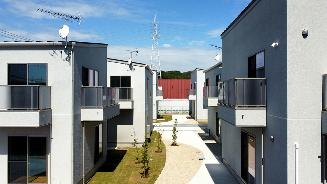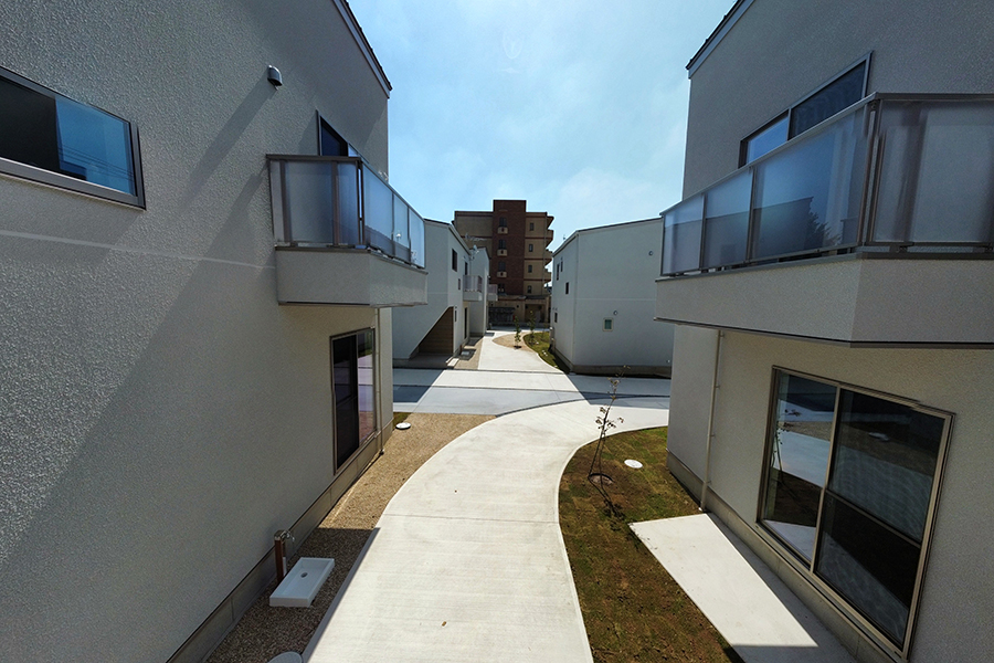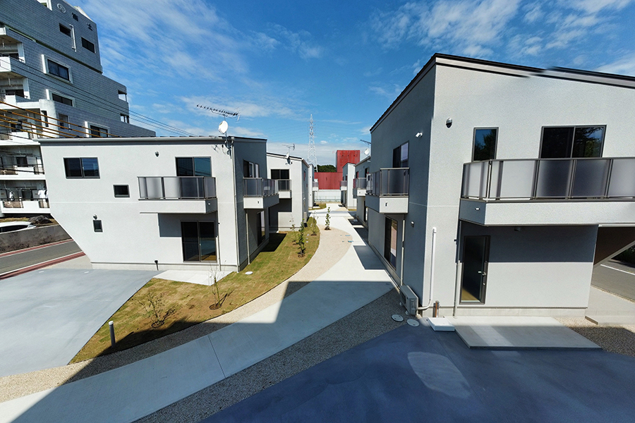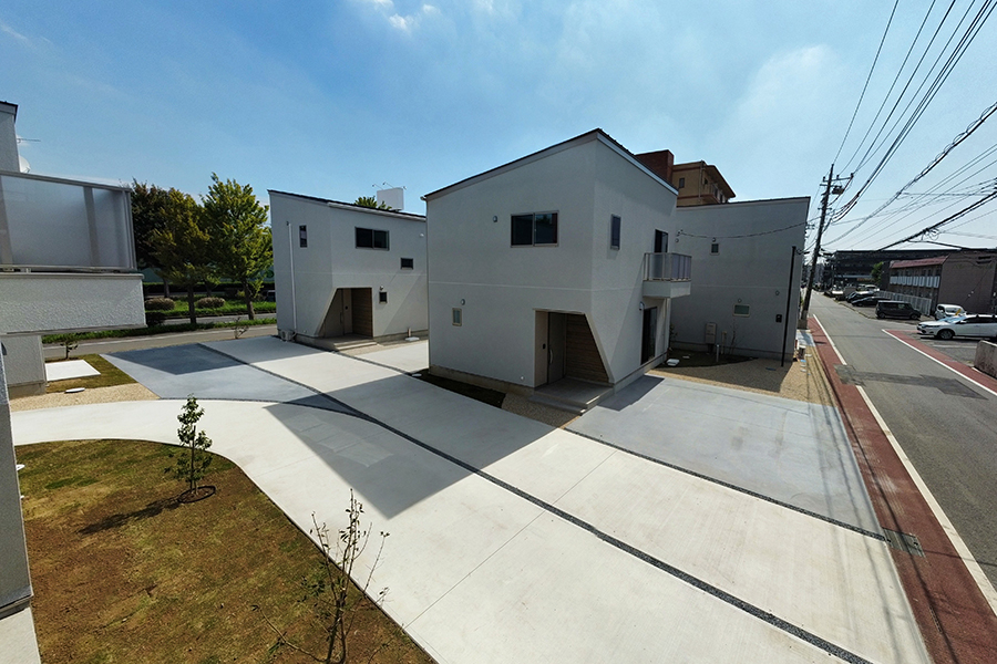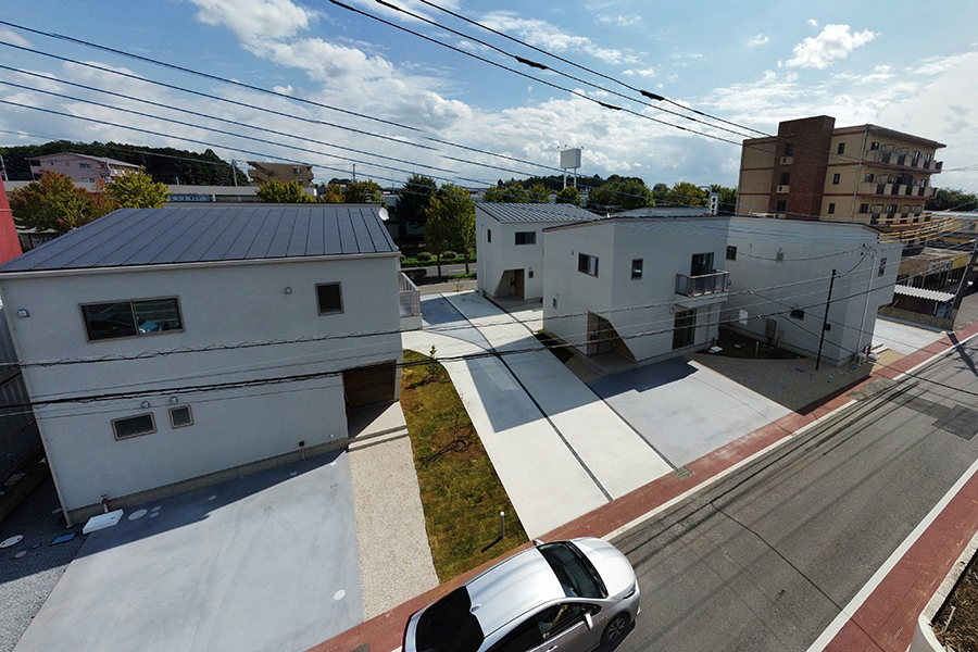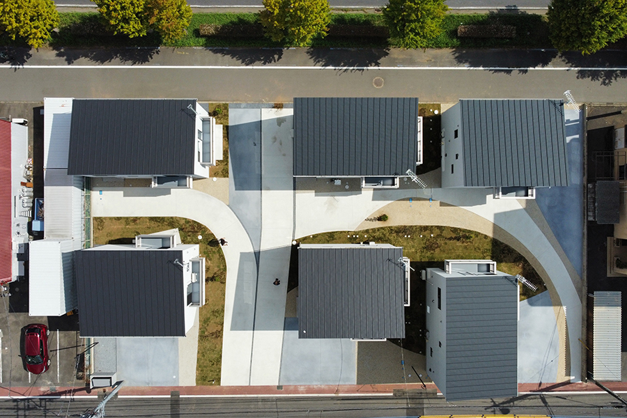 角度を振った切妻屋根の建物がランダムに配置される光景は、2階建ての多いつくば市の景観になじみます。敷地内の車道と駐車場を庭の一部の連続体としてグラフィカルに見せることで、駐車場=空き地という印象を払拭させ、敷地全体を大きな庭のように見立てます。住戸のプライバシーと日射に配慮した位置に植栽を計画し、敷地に面する大通りの並木の光景の延長として緑豊かな環境が広がります。