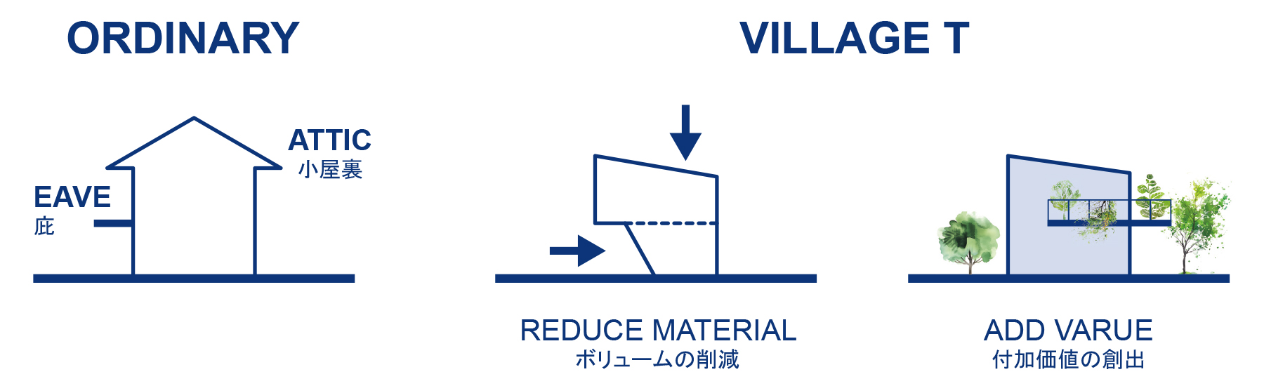 建物はでっぱり引っ込みのない矩形に統一し、屋根裏を設けず屋根の高さを通常よりも抑えることで軸組の材料を少なくしています。