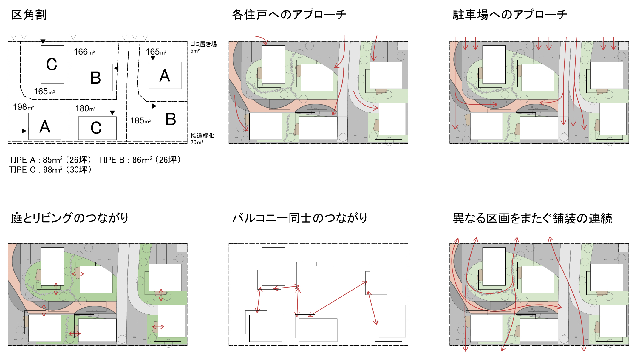 つくばの条例により、1住戸の区画は165平米以上となるようにしていますが、庭の区画の間には塀を設けず、住民通しでルールを決めて、使い勝手や景観をシェアする公共空間とします。