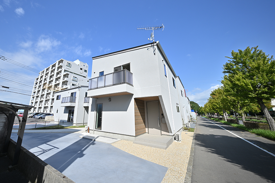 屋根は片流れとし、ランダムな方向に住戸と配置することで同じ形の建売住宅が並ぶのとは異なる都市のような景観を生み出すことを意識しました。